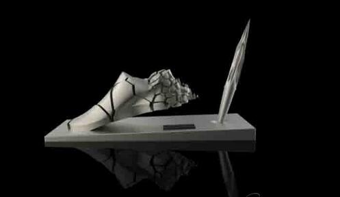 隨著3D打印的出現(xiàn)以及被廣泛應(yīng)用,一大批優(yōu)秀的設(shè)計(jì)師將一件件極具藝術(shù)美感的設(shè)計(jì)作品精確形像地還原于觀眾的視線。這件極具藝術(shù)設(shè)計(jì)感的跑鞋臺(tái)牌作品是國(guó)內(nèi)著名的美女設(shè)計(jì)師宋波紋設(shè)計(jì)的一款商務(wù)禮品,鞋子的造型表達(dá)的是關(guān)于速度,在奔跑的時(shí)候產(chǎn)生形象延時(shí)的感覺,裂變的重復(fù)排列讓鞋子帶有一定的力量感。而整體形象是一個(gè)動(dòng)態(tài)的靜幀,動(dòng)靜結(jié)合,讓小雕塑穩(wěn)重、生動(dòng)。